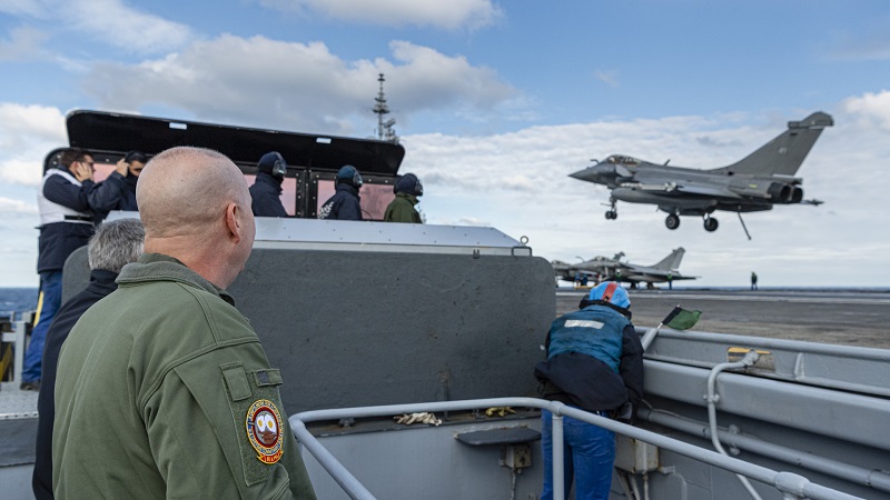 À bord du charles de gaulle. Le temps d'échanger quelques mots, puis de monter sur l'une des passerelles qui surplombe la piste d'envol et le bruit. Au sein de la coalition internationale, la france fournit la plus importante contribution.
